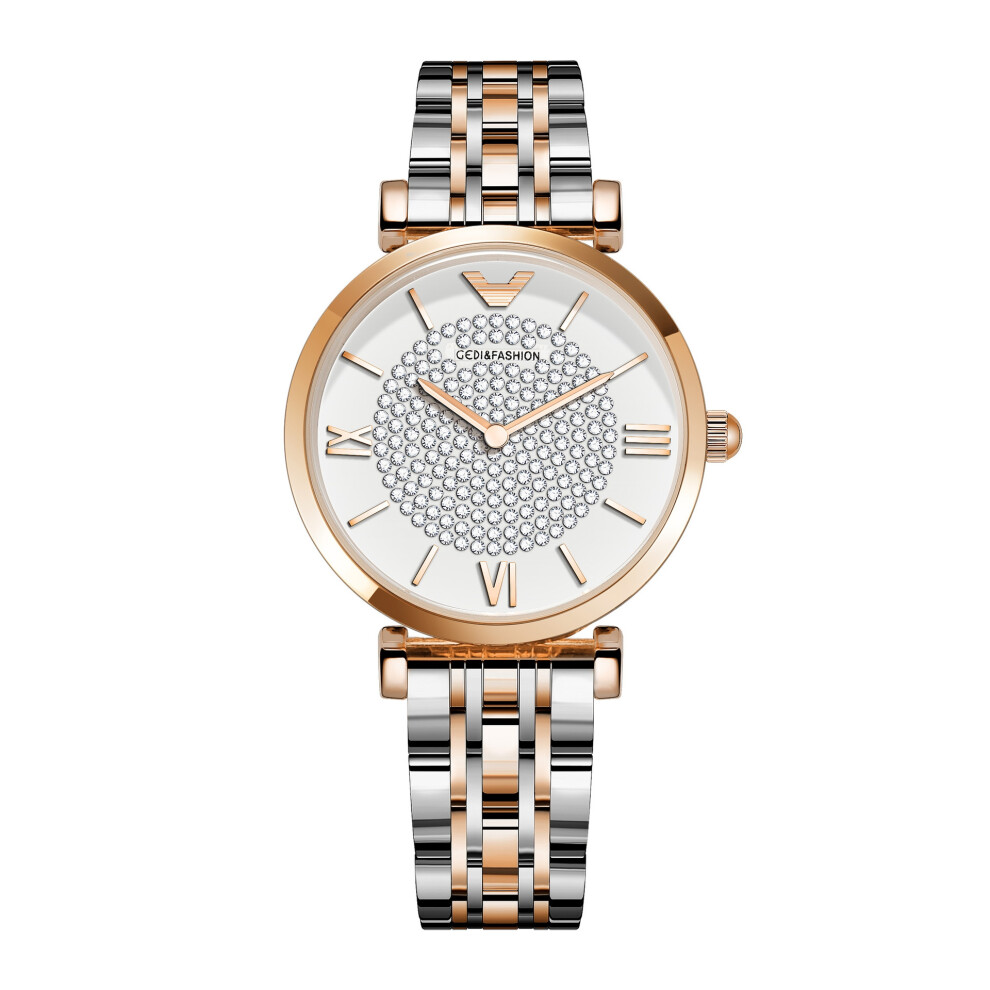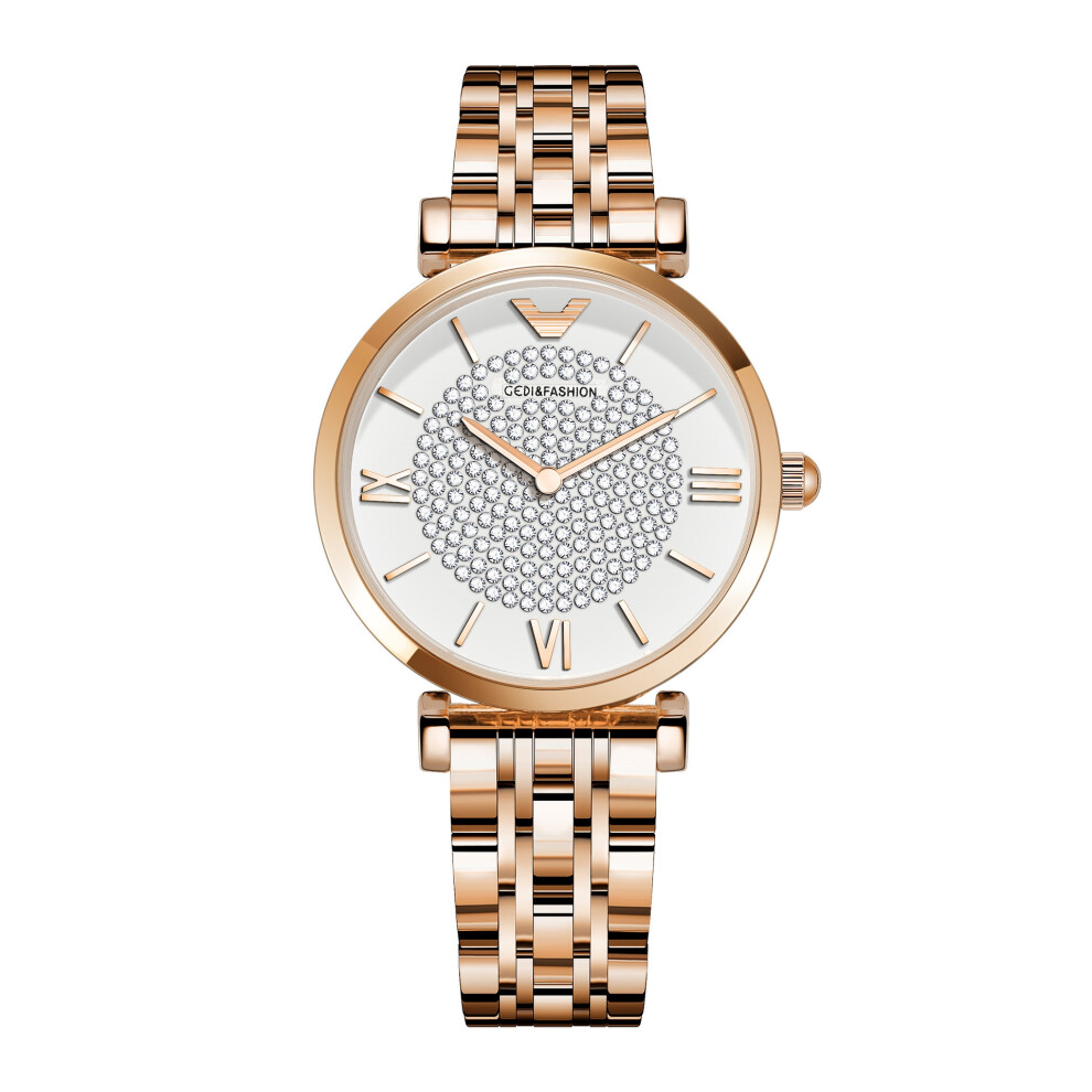 (The rose gold shell is interspersed with rose patterns) A quartz steel band watch for women, studded with diamonds and glittering with a starry sky