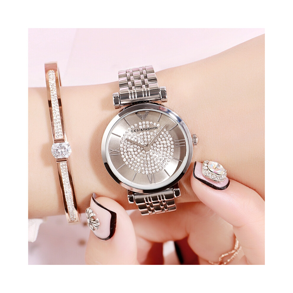 (Silver shell and grey plate) A quartz steel band watch for women, studded with diamonds and glittering with a starry sky