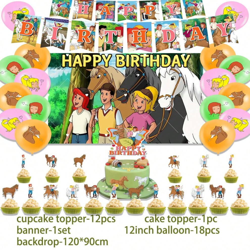 (N-1set, Other) Cartoon Bibi & Tina Theme Birthday Party Supplies Decorative Game Balloon Banner Backdrop Cake Topper Kids Baby Shower Gifts