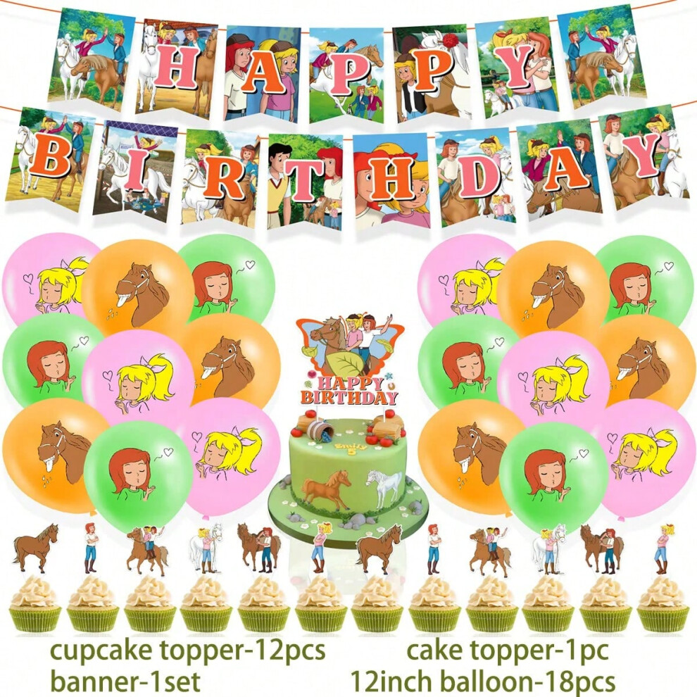 (N-8, Other) Cartoon Bibi & Tina Theme Birthday Party Supplies Decorative Game Balloon Banner Backdrop Cake Topper Kids Baby Shower Gifts