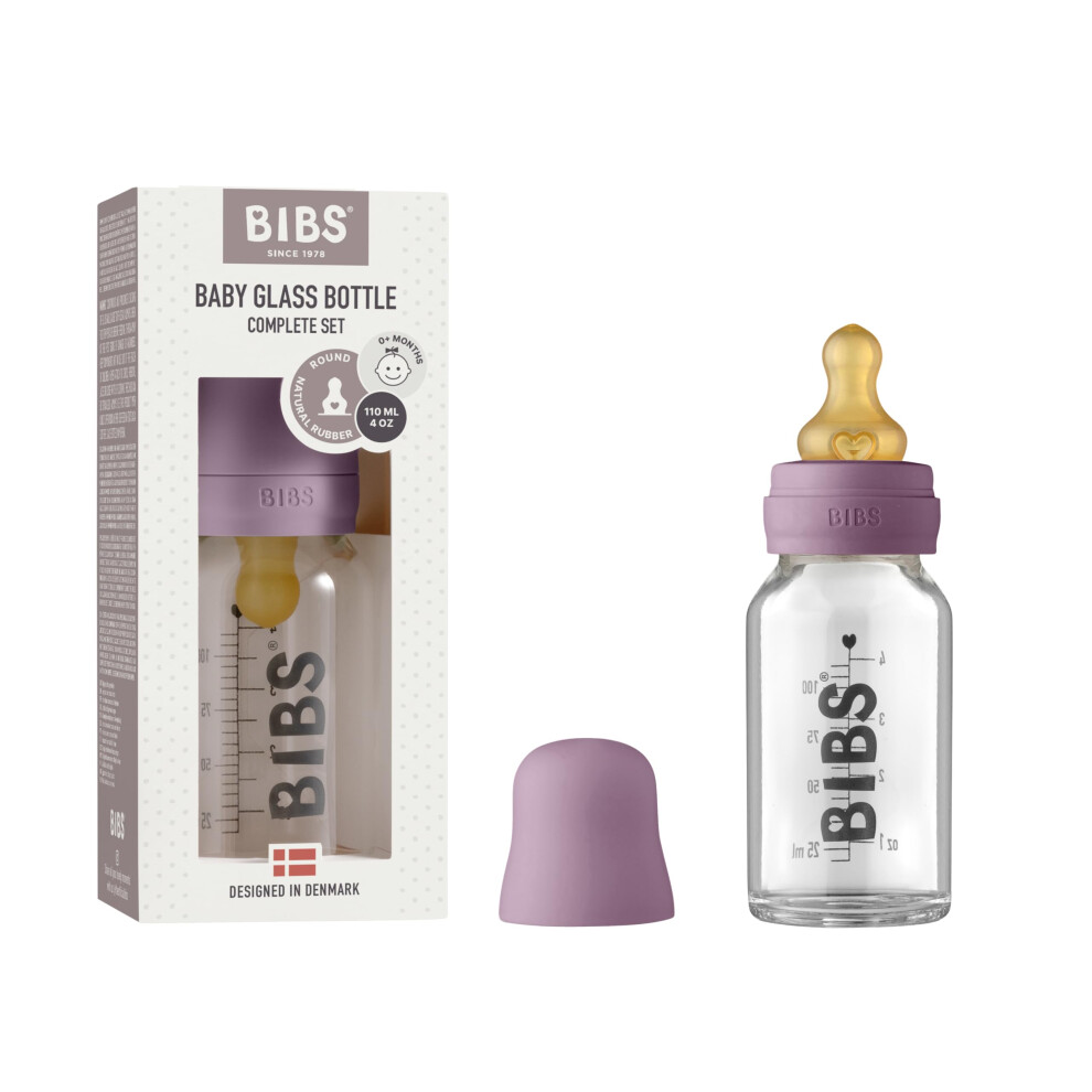 BIBS Baby Glass Bottle. Anti-colic. Round Natural Rubber Latex Nipple. Supports Natural Breastfeeding, 110 ml, Mauve