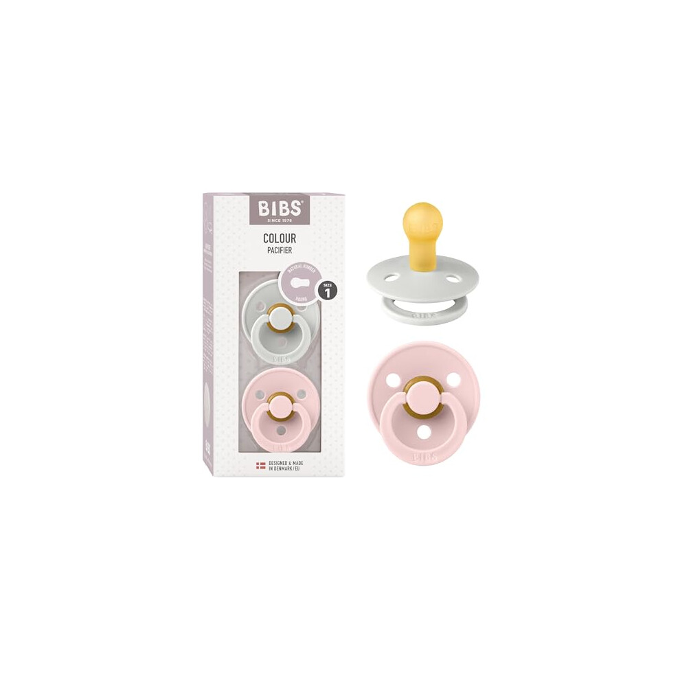 BIBS Colour Soother 2-Pack, BPA Free Dummy Pacifier, Round Nipple. Natural Rubber Latex, Size 1 (0-6 Months), Haze/Blossom