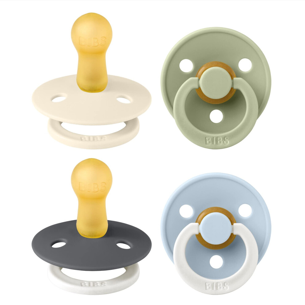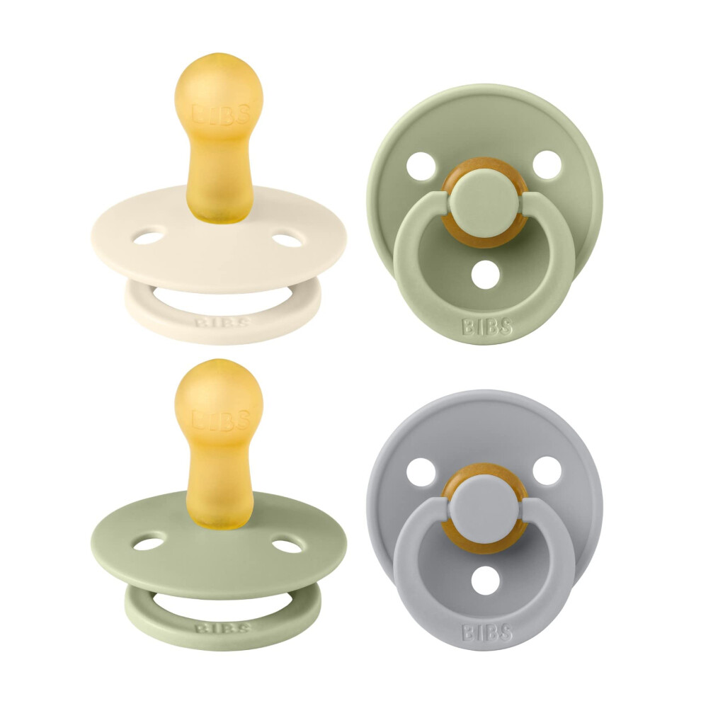 BIBS Colour Soother 4-Pack, BPA Free Dummy Pacifier, Round Nipple. Natural Rubber Latex, Made in Denmark. 0-6 Months (Pack of 4), Sage Mix