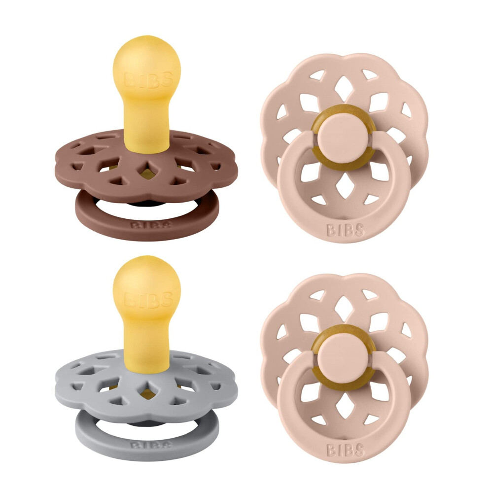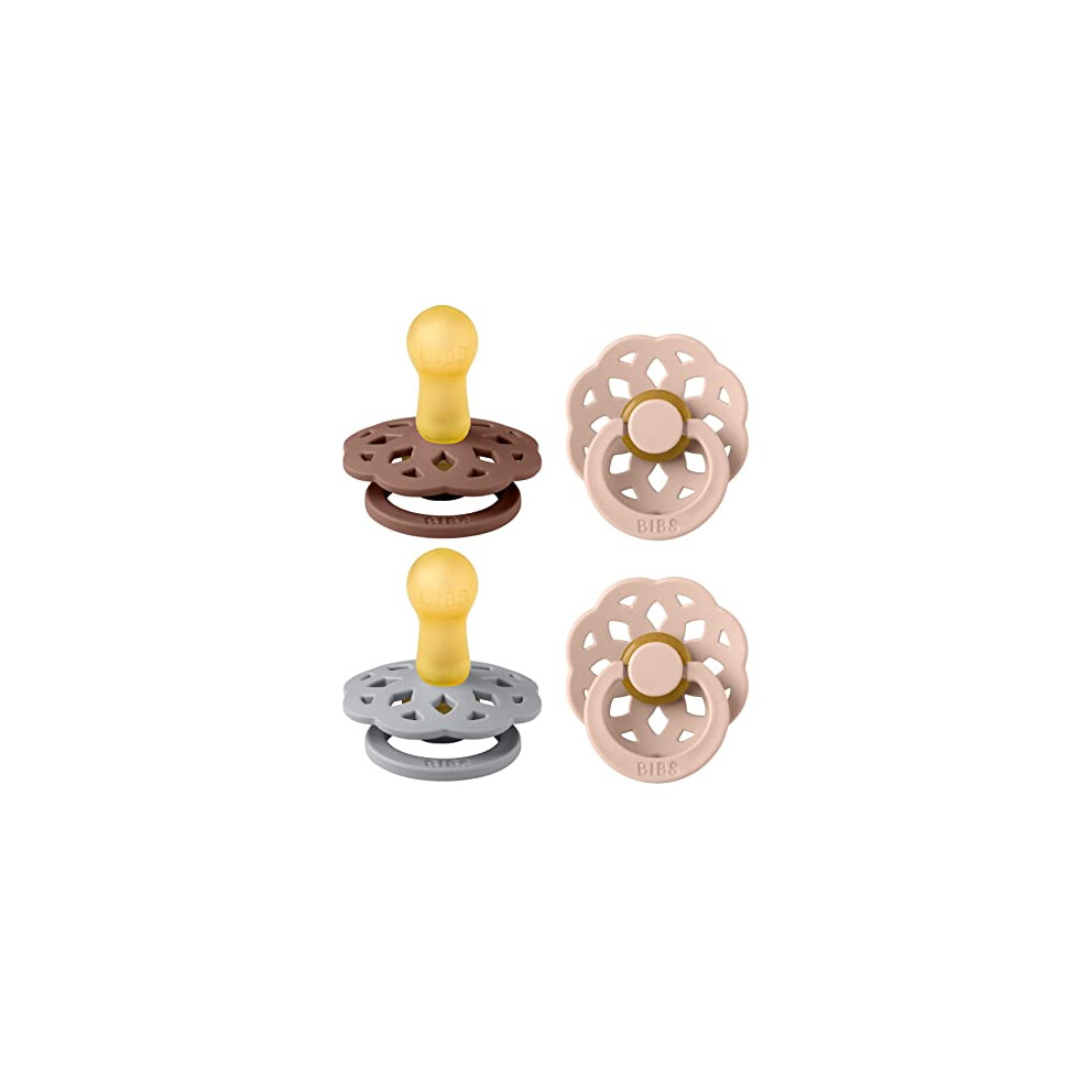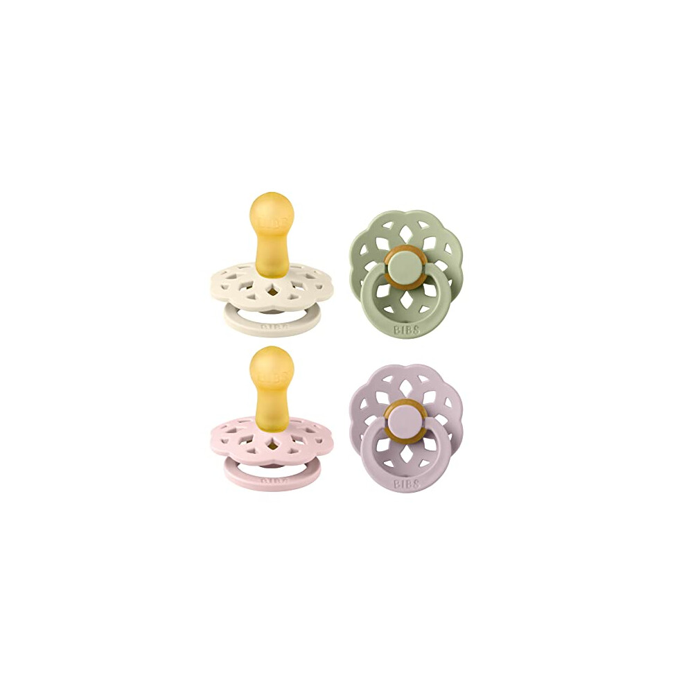 BIBS Boheme Soother 4-Pack. BPA Free Dummy Pacifier, Round Nipple. Natural Rubber Latex, Made in Denmark. 6-18 Months (Pack of 4), Dusky Lilac Mix