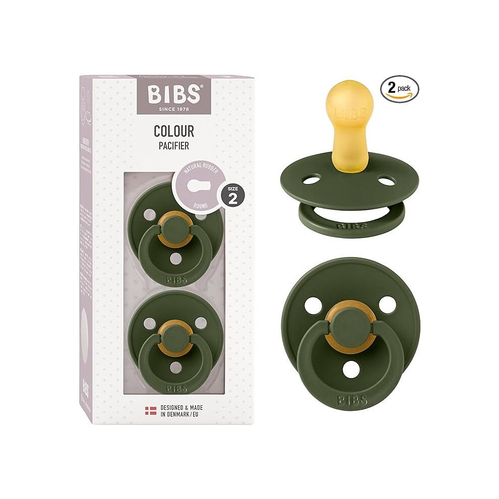 BIBS Colour Soother 2-Pack, BPA Free Dummy Pacifier, Round Nipple. Natural Rubber Latex, Size 1 (0-6 Months), Woodchuck/Hunter Green