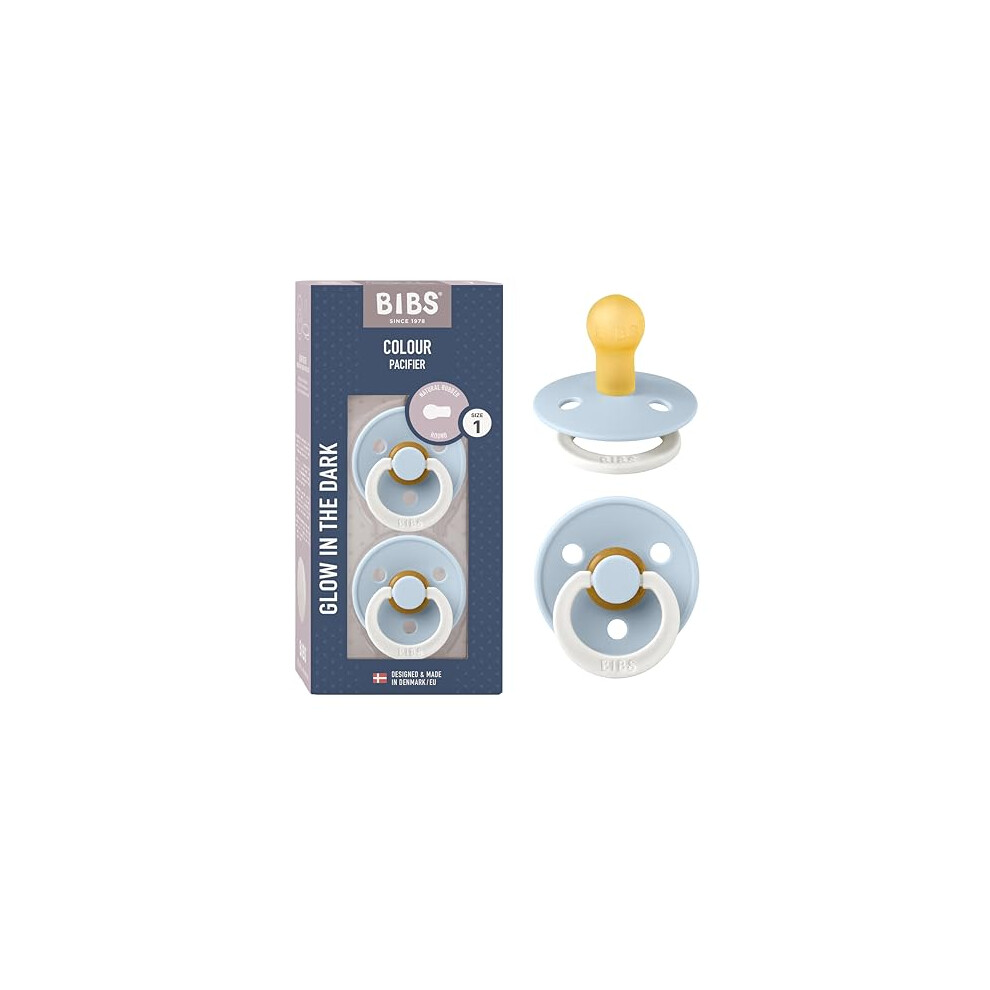 BIBS Colour Night Soother 2-Pack, BPA Free Dummy Pacifier, Symmetrical Nipple. Natural Rubber Latex, Made in Denmark, Size 1 (0-6 Months), Baby Blue