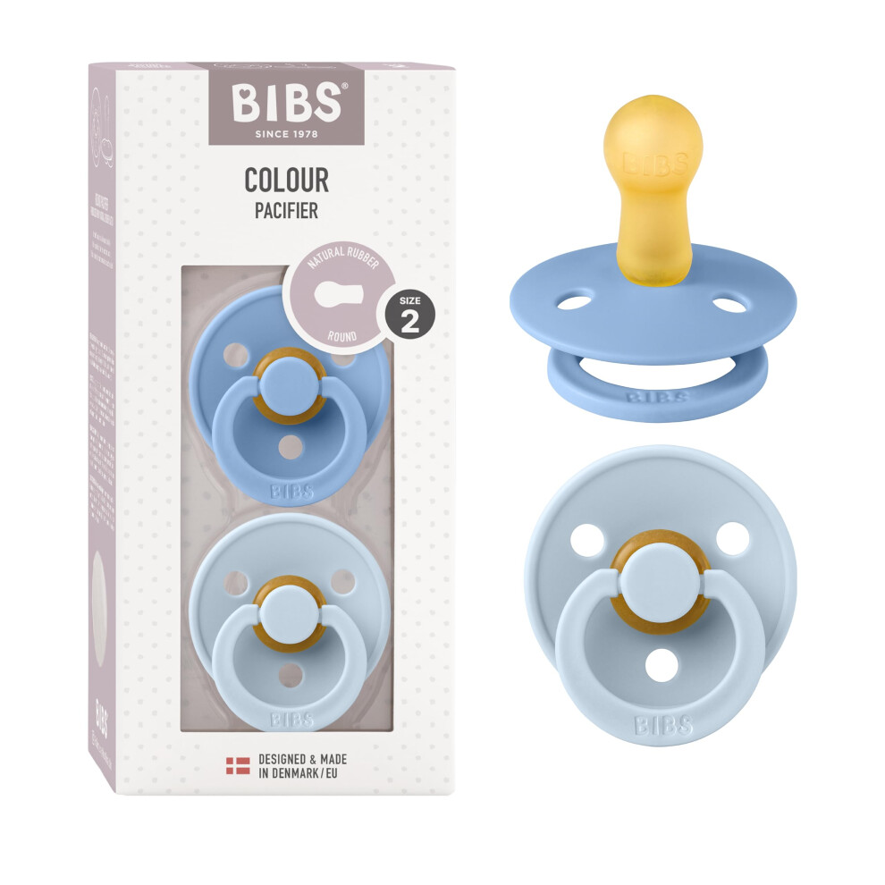 BIBS Colour Soother 2-Pack, BPA Free Dummy Pacifier, Round Nipple. Natural Rubber Latex, Size 2 (6-18 Months), Sky Blue/Baby Blue