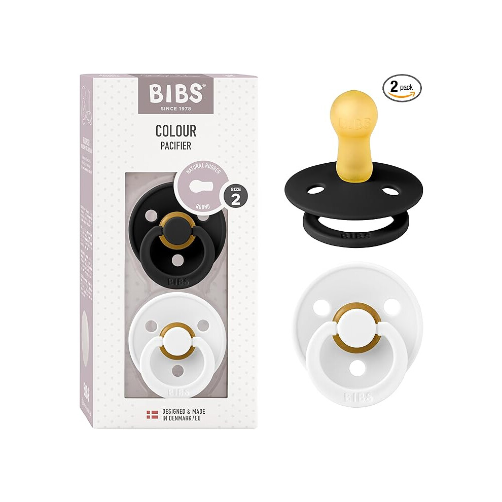 BIBS Colour Soother 2-Pack, BPA Free Dummy Pacifier, Round Nipple. Natural Rubber Latex, Size 1 (0-6 Months), Black/White