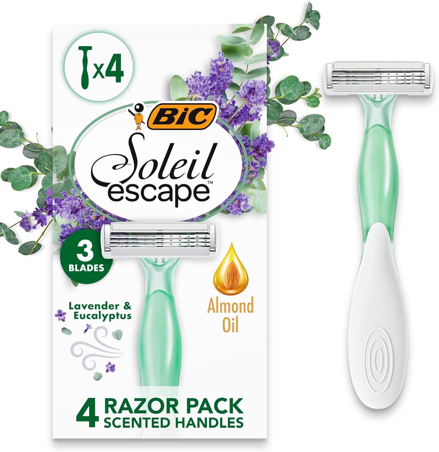 BIC Soleil Escape Women's Disposable 3 Blade Razors, Ideal Bikini Line Razor, Lavender & Eucalyptus Scented Handles, 4-Pack