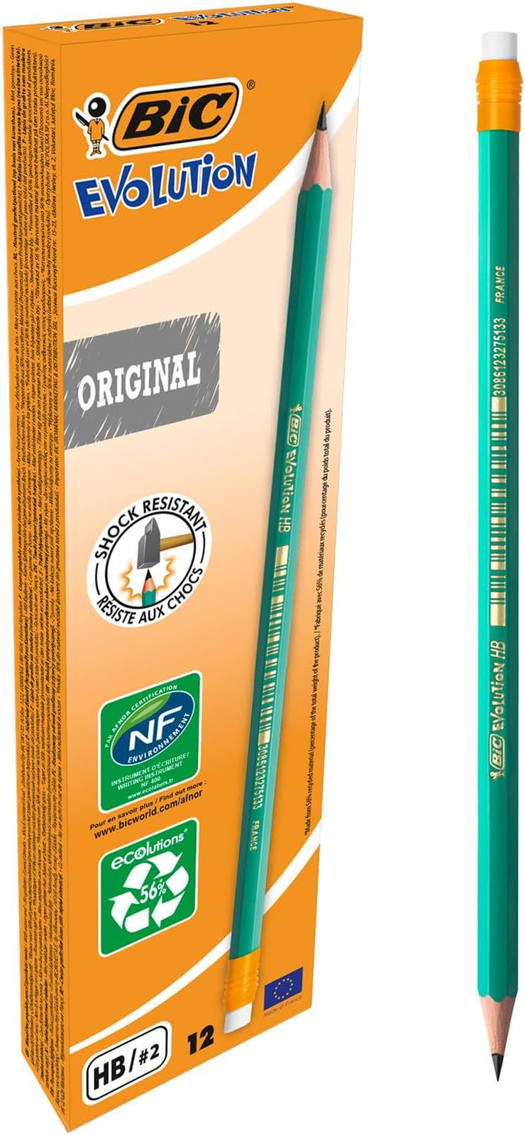 BIC Ecolutions Evolution 655 HB Pencil with Eraser, Pack of 12, Green Wooden Pen