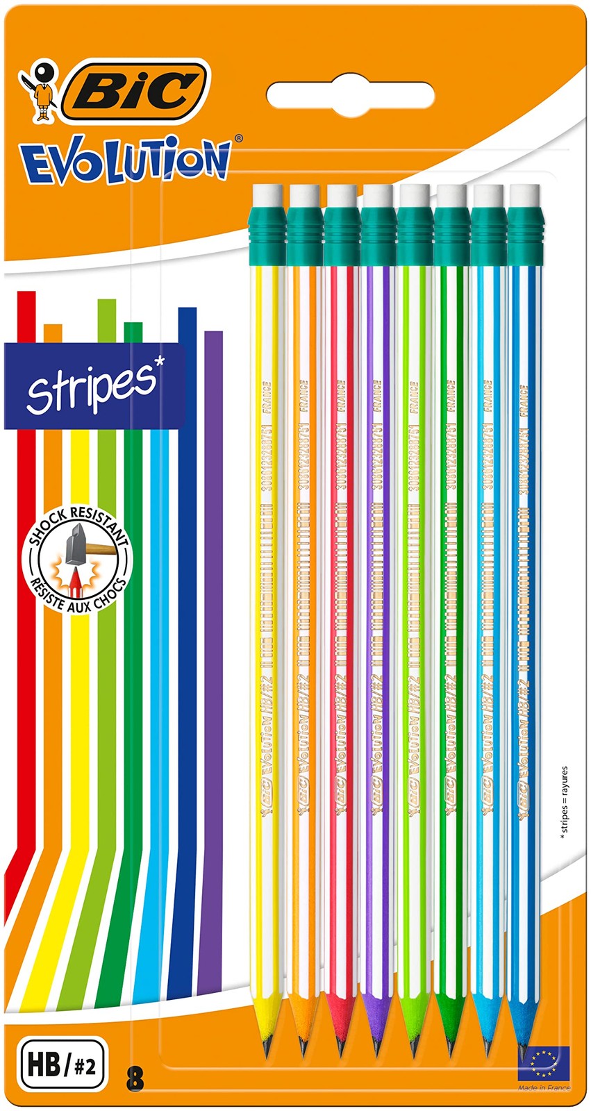 8 Pack BiC Evolution Stripes Graphite Pencils With Eraser Shock Resistant HB/#2