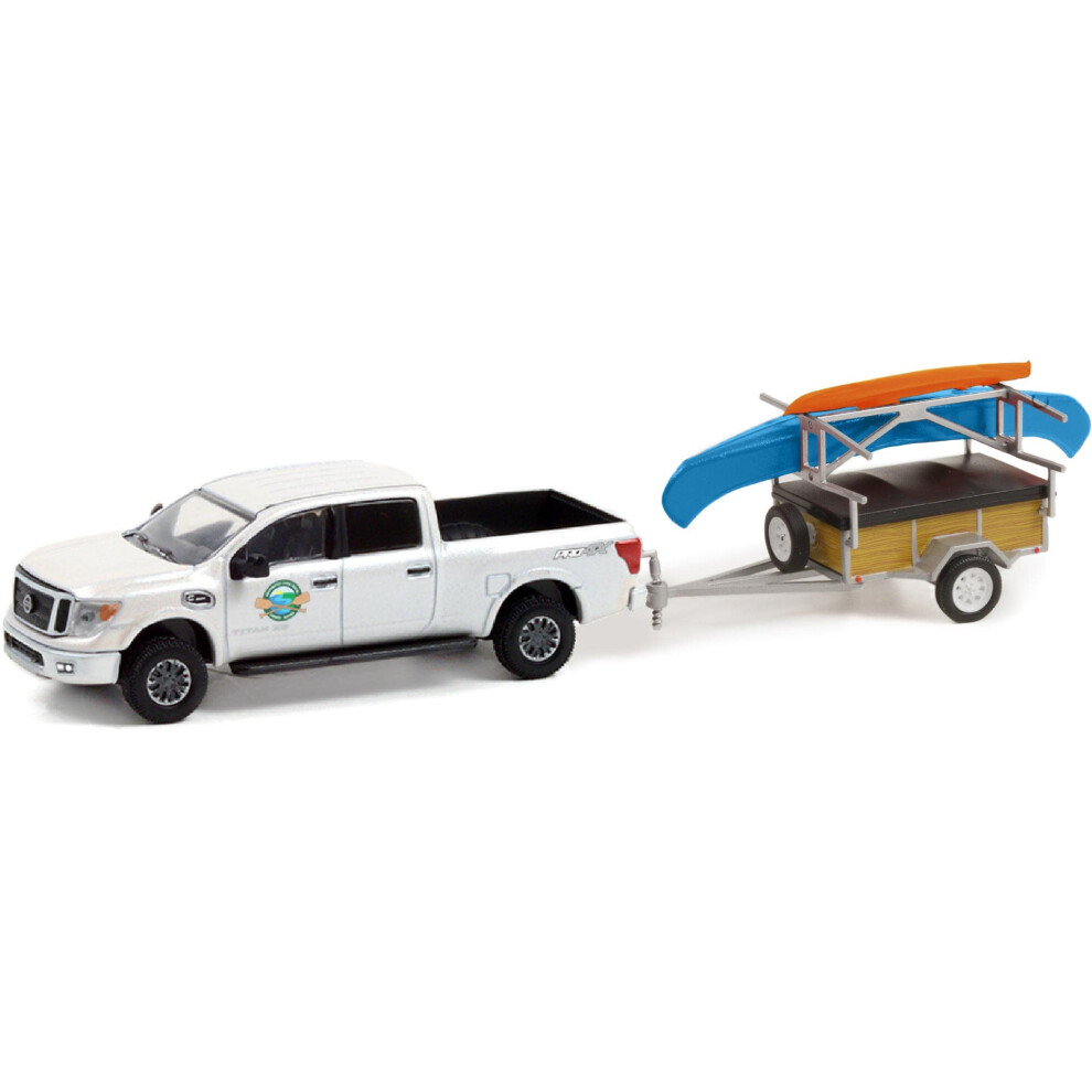 Greenlight 32230-A Hitch & Tow Series 23 - 2019 Titan XD Pro-4X Whitewater Canoe Rental with Canoe Trailer with Canoe Rack Canoe and Kayak 1/64 Scal
