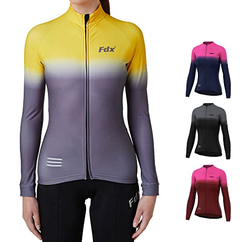 FDX Women’s Thermal Cycling Jersey Long Sleeve Italian Roubaix Winter Bike Jacket, Windproof Water Resistant Cycling Top, Breathable Full Zip High Visibility Bicycle Shirt with Pockets(Yellow -S)