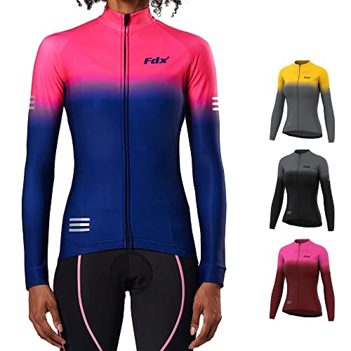 FDX Women’s Thermal Cycling Jersey Long Sleeve Italian Roubaix Winter Bike Jacket, Windproof Water Resistant Cycling Top, Breathable Full Zip High Visibility Bicycle Shirt with Pockets(Navy/Blu -M)