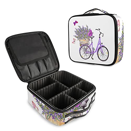 Violet Bicycle with Lavender Flowers in Basket and Butterflies Women's Portable Makeup Bags with Handle, Adjustable Dividers, Travel Cosmetic Toiletry Accessories Storage Organizer for Girls