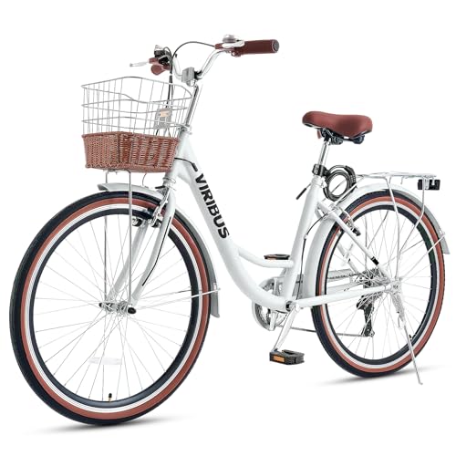 Viribus Women’s Comfort Bike, 24 Inch 7 Speed Bicycle for Women, Beach & City Cruiser Bike with Rattan Basket Steel Rack, Step Through Bike for Women Youth Adults, White