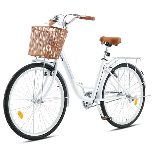 Viribus Vintage Ladies Bike with Basket, 26 Inch Girl’s Dutch Style City Bicycle with Carbon Steel Frame, Dual V Brakes, Single Speed Women’s Comfort Bike with Adjustable Seat & Handlebars, White
