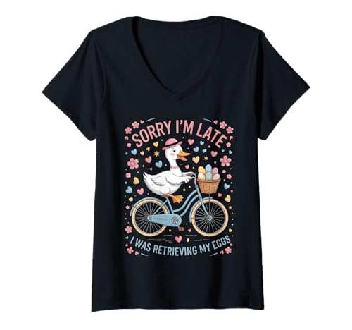 Women's Sorry Im Late I was Retrieving My Eggs Funny Easter Duck V-Neck T-Shirt