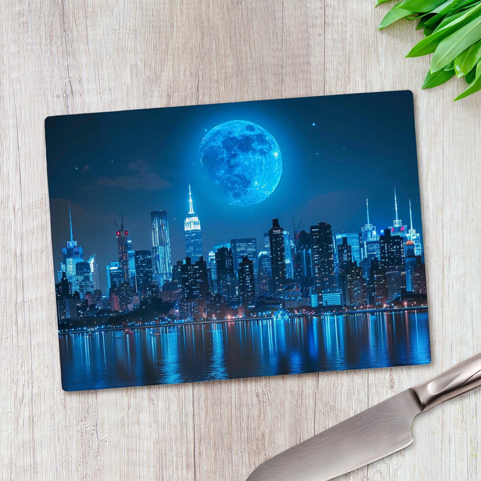 Cityscape and Big Moon Scene Glass Chopping Board Large Kitchen Worktop Saver