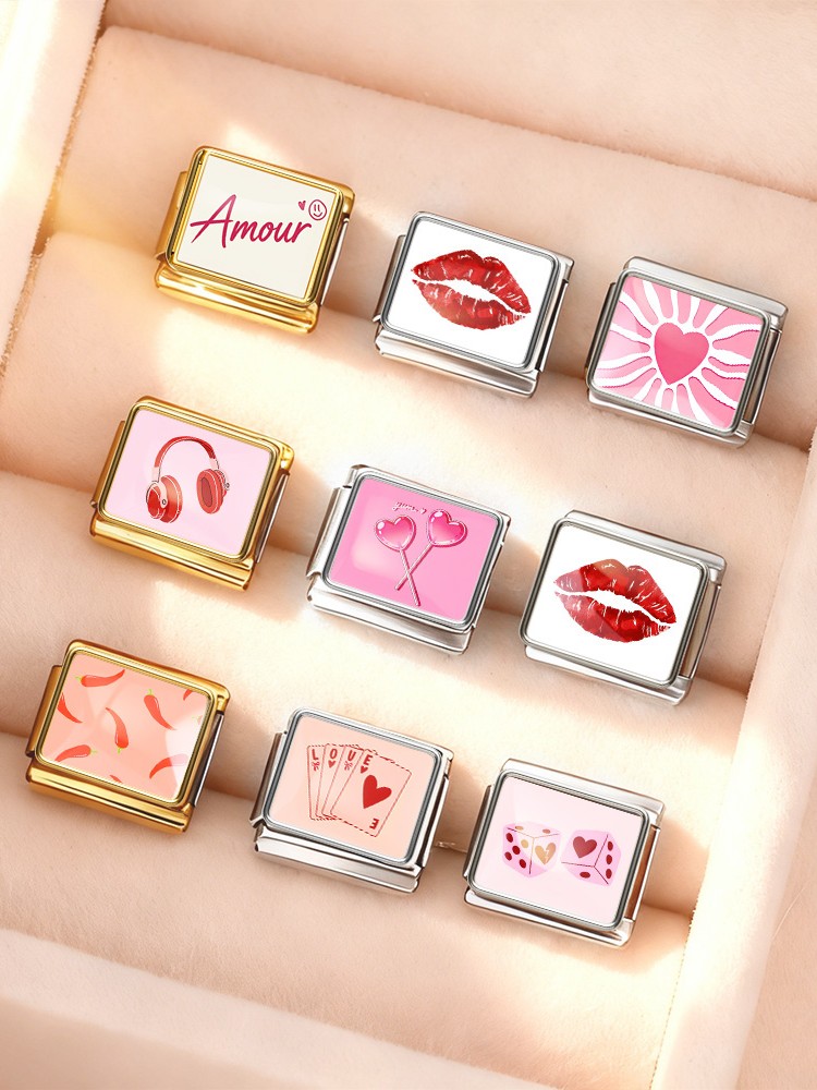 Fashion Pink Series Love Dice Big Red Lips Headphones Italian Link Fit 9mm Stainless Steel Bracelet Making DIY Charm Jewelry