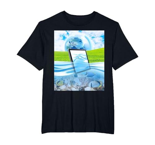 Frutiger Aero Aesthetic Tech Water Fishes Monitor Screen T-Shirt, Men's Big and Tall, Black, 5X Tall