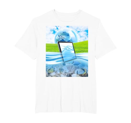 Frutiger Aero Aesthetic Tech Water Fishes Monitor Screen T-Shirt, Men's Big and Tall, White, 5X Tall