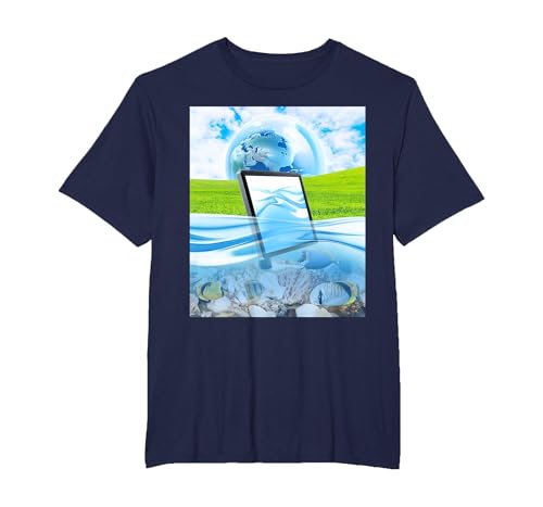 Frutiger Aero Aesthetic Tech Water Fishes Monitor Screen T-Shirt, Men's Big and Tall, Navy Blue, 5X Tall