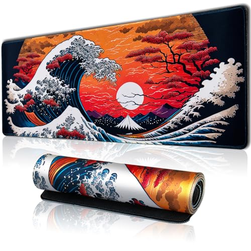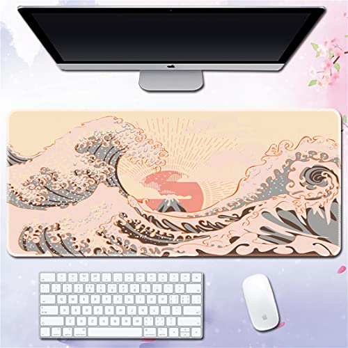Hopipad Japanese Sea Waves Large Gaming Mouse Pad for Desk, Desk Mat with Seamed Edges, Waterproof Desk Pad, Non-Slip Rubber Base, 31.5x11.8 Inch Keyboard Pad Computer Mat, Big XL Mousepad