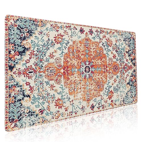 Orange Teal Boho Gaming Mouse Pad XXL Vintage Rug Bohemian Extended Large Desk Mat Big Mousepad Non-Slip Rubber Base Stitched Edge Long Mousepad for Desktop Office PC Gamer, 35.4 x 15.7 Inch
