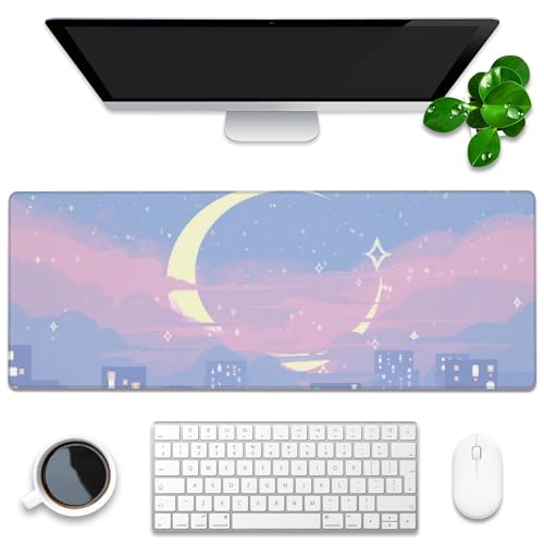 KOAIWPAE Desk Mat, Anime Moon City Night Scene Extended Gaming Mouse Pad Large, 31.5"x11.8" Big Mouse Pad with Non-Slip Base and Stitched Edge, Long Computer Keyboard Mouse Mat for Home Office Work