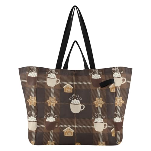 Large Tote Bags Big Sturdy Kitchen Grocery Bags Bridesmaid Bag for Women Spa Shower Necessities Christmas Brown Plaid Gingerbread Mugs Cookies