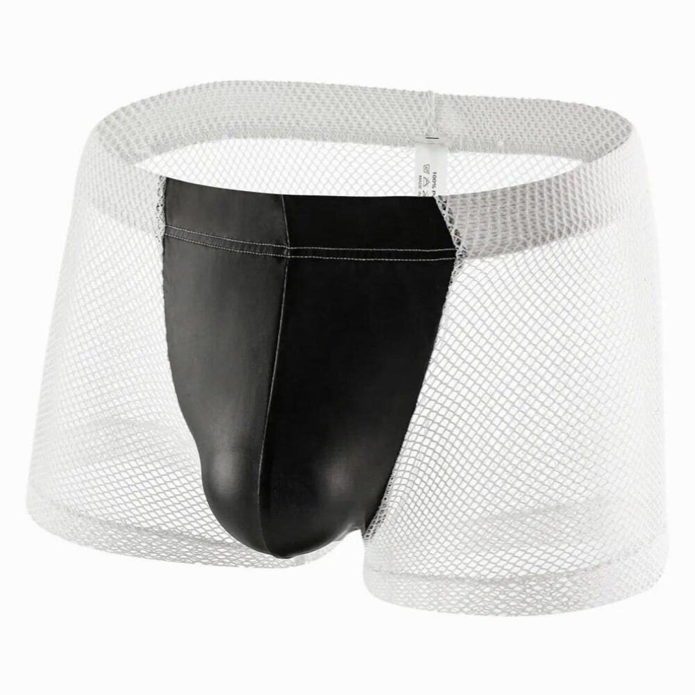 PU Leather + Mesh Boxer Mens Big Penis Pouch See Through Male Sexy Underwear Gay Transparent Trunks Shorts Underpants Jockstraps