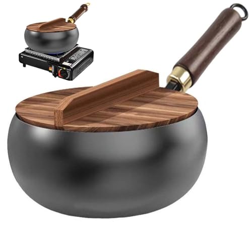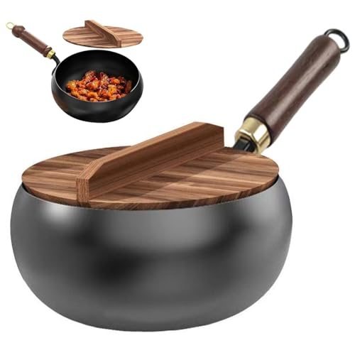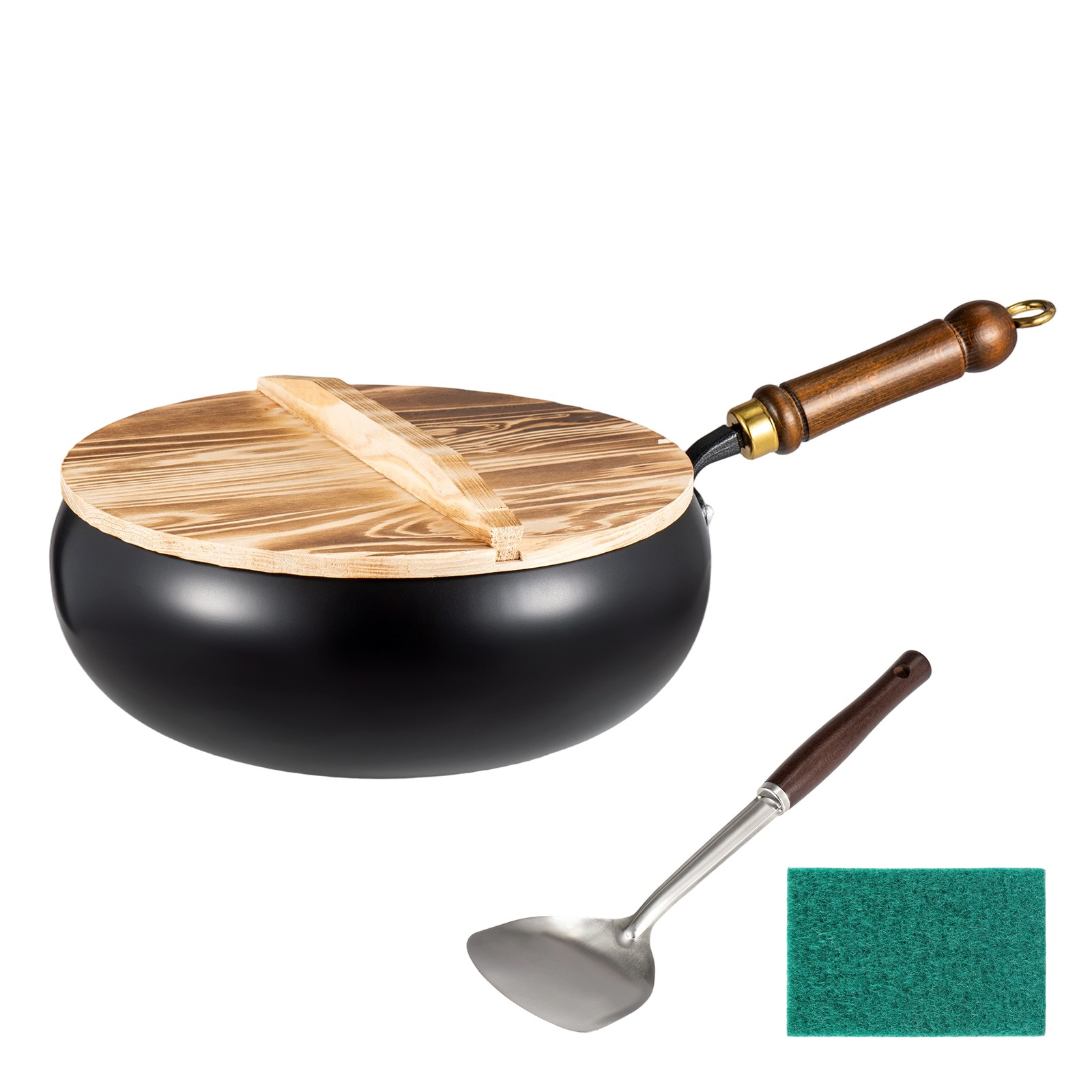 Uncoated Iron Pan with Wooden Lid,Hand Forged Non-Stick Irons Pans,Big Belly Pot