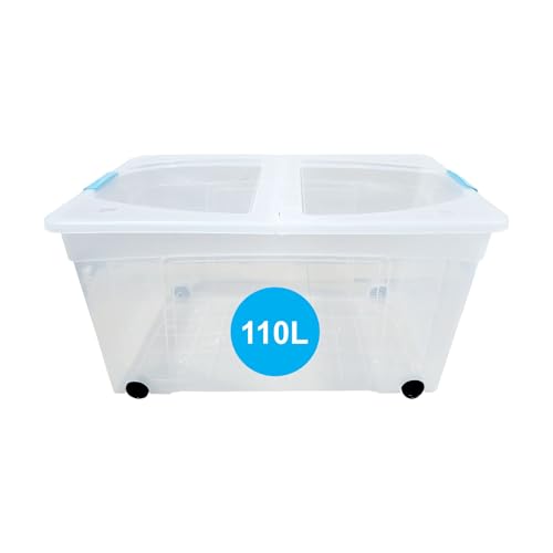 RelianceUK 2 x 110 Litre Extra Large Plastic Storage Boxes with Clip Lock Lids & Wheels | Clear Big Containers for Clothes Shelves | 110L Stackable Multipurpose Storage Tubs for Home Office Kitchen
