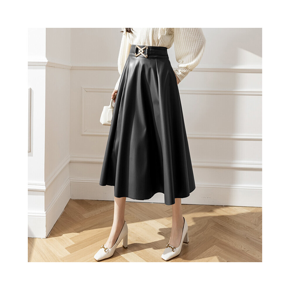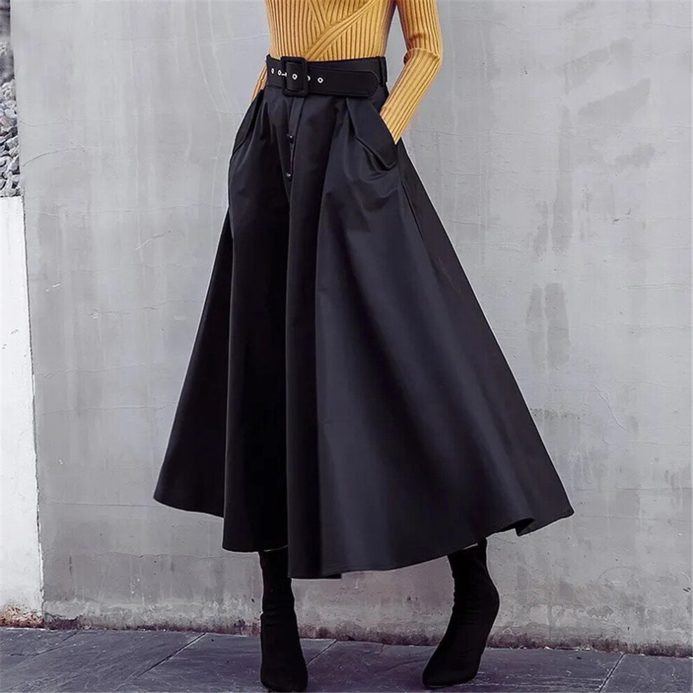 PU Leather Skirt Women Autumn Winter High Waist Pocket A Line Big Swing Umbrella Skirt Work Midi Long Skirts