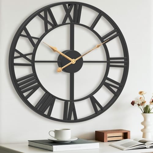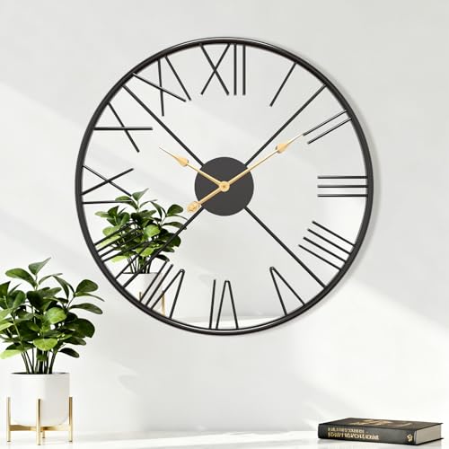 Pytha Sight Large Wall Clock,60CM Black Big Skeleton Modern Decorative Roman Numerals Silent Vintage Wall Clocks for Living Room,Kitchen,Bedroom,Office,Fireplace,Home