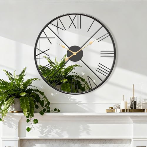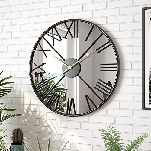 20inch Large Modern Mirror Wall Clock for Living Room,Decorative Metal Roman Numeral Big Clock Home Decor Silent Non Ticking Mirrored 50CM Wall Clocks for Kitchen, Bedroom, Study,Black Decoration