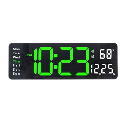 Plumeet Digital Wall Clock, 16 Inches LED Wall Clocks with Remote Control, Big Digits, Auto-Dimming, 2 Alarm, Digital Alarm Show Date Week Temp, Green