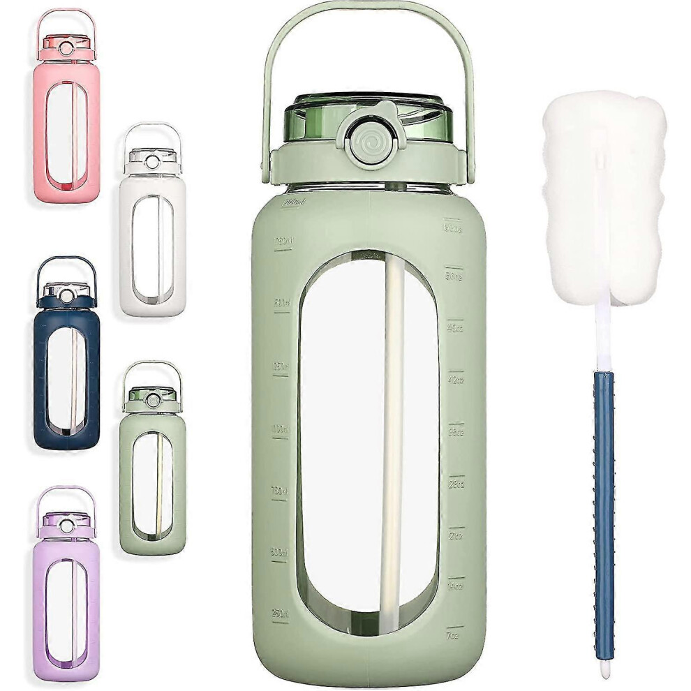 Bluego 64oz Glass Water Bottles with Straw Time Marker Half Gallon Large Motivational Water Bottle with Silicone Sleeve 2l Big Glass Water Jug Bottle