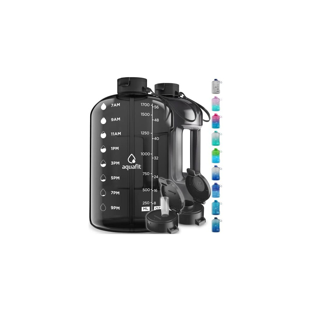 AQUAFIT 2 Litre Water Bottle with Straw - Water Bottles 2L with Time Marker - Half Gallon Big Bottle with Straw - Large Bottle For Gym - Grey, 2 Lids