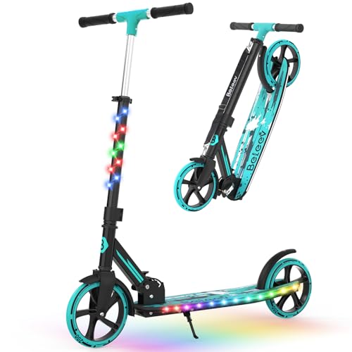 BELEEV V9 Scooters for Kids Ages 6+ with Light-Up Stem & Deck, 2 Wheel Folding Scooter for Adults Teens, Big Wheel Lightweight Scooter for Boys and Girls, 4 Adjustable Height, Max Load 220 lbs(Aqua)