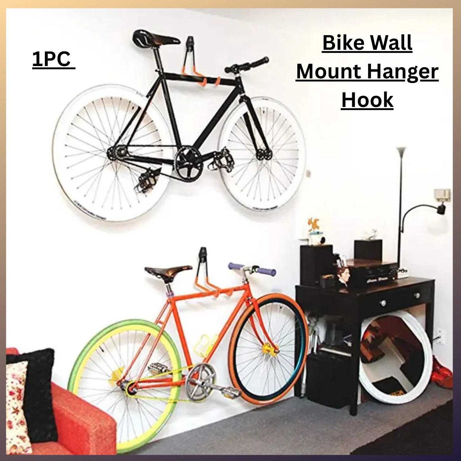 3-in-1 Bike Wall Mount Hanger with Hooks, Space Saving Bicycle Rack for Mountain/Road/Hybrid Bikes, Horizontal Bike Hanger Holder for Garage or Home (Warm white)