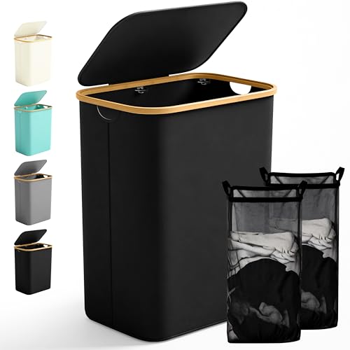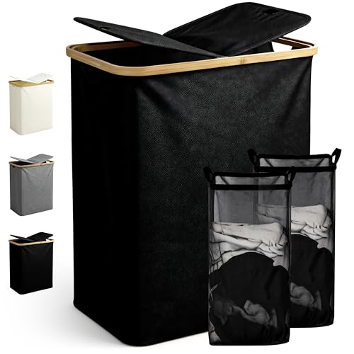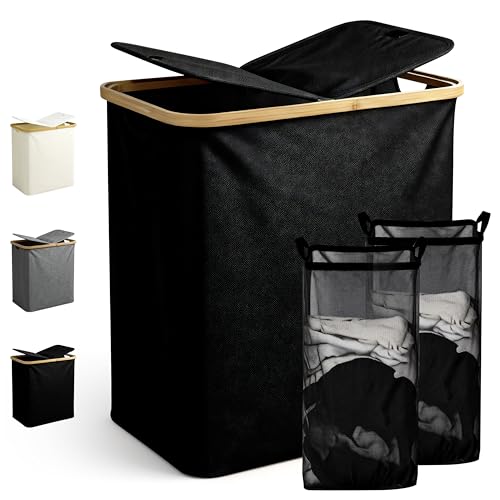 Lifewit 160L Laundry Basket with Lid, 2 Compartments Washing Basket with 2 Removable Liners & Bamboo Frame, Dirty Clothes Bin for Laundry Room Bedroom, Black