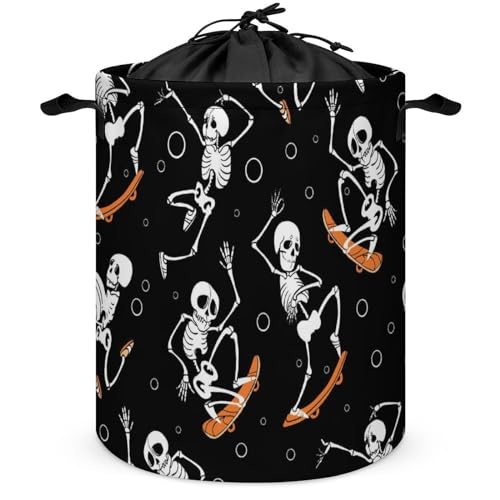 Skeletons Skating Seamless Drawstring Collapsible Canvas Storage Basket, with Handles Foldable Storage Bin, Durable for Laundry Toys Clothes Bedroom Office