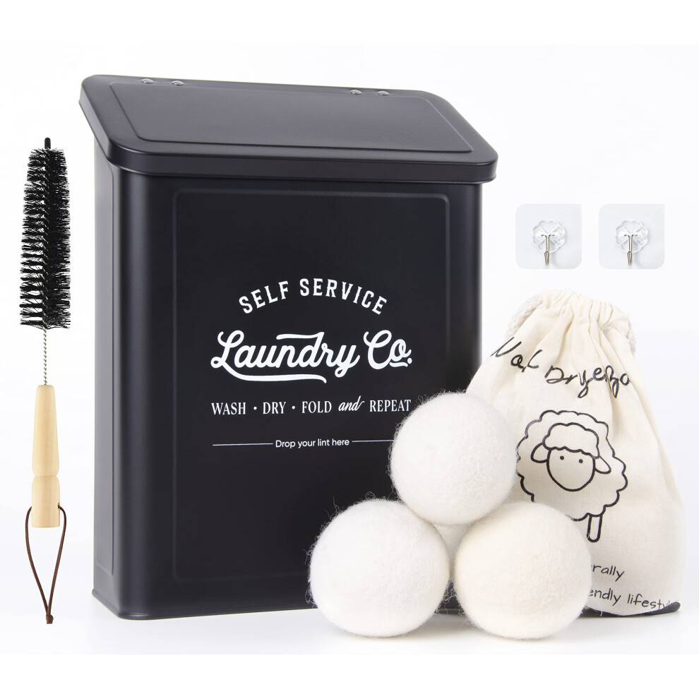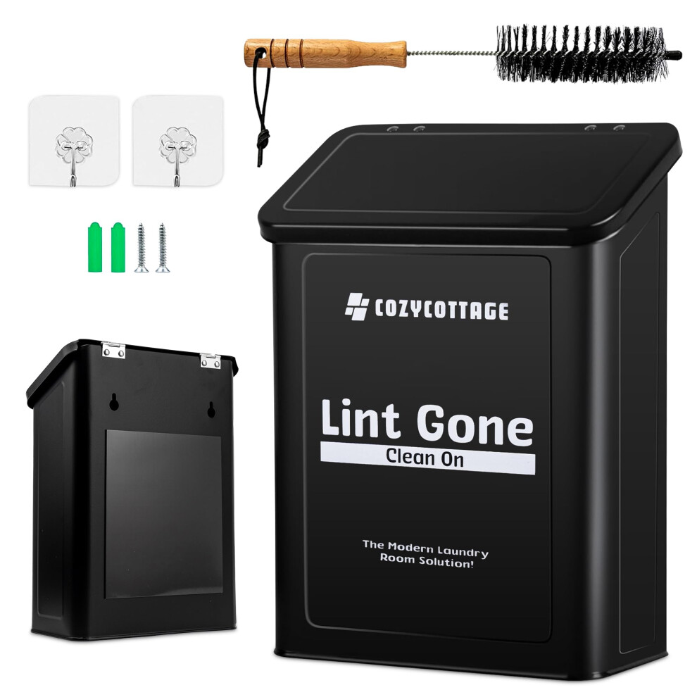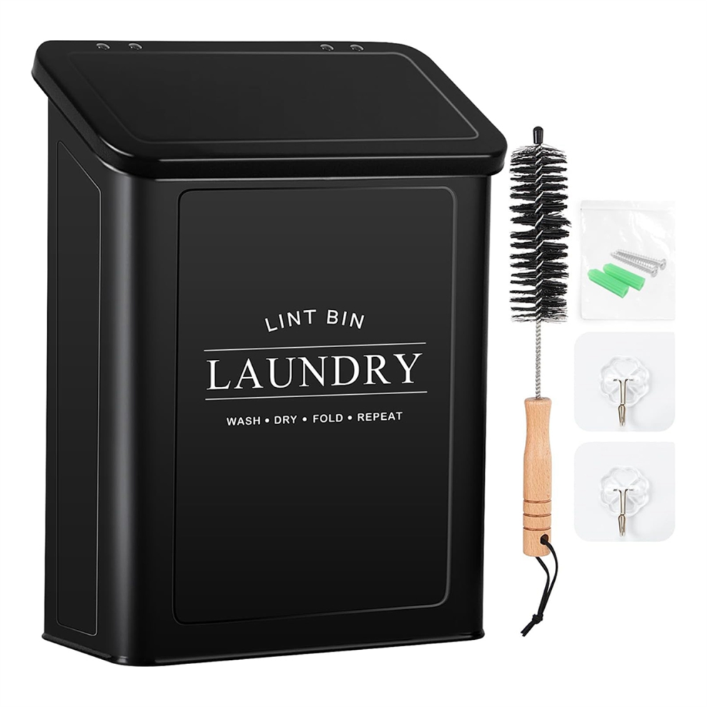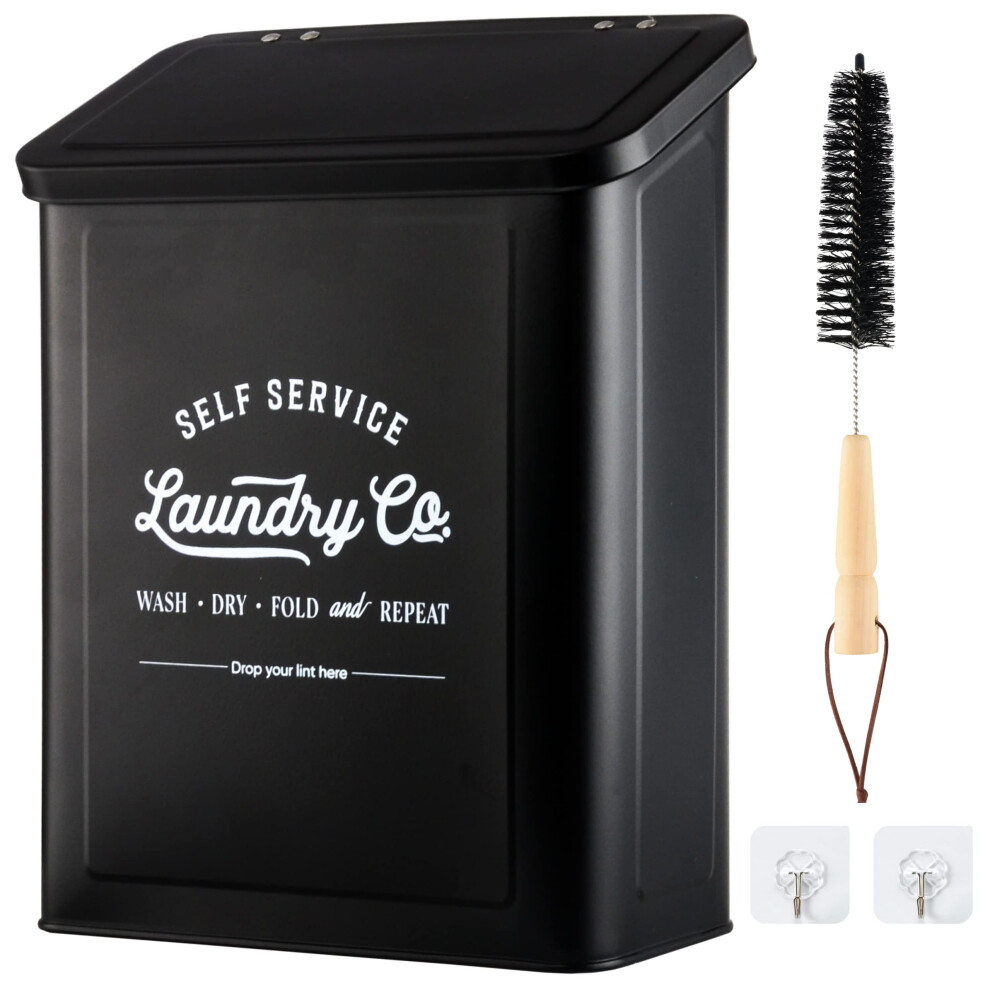 Magnetic Lint Bin for Laundry Room, Metal Container with Lid and Brush, Wall Mounted Box Dryer Black
