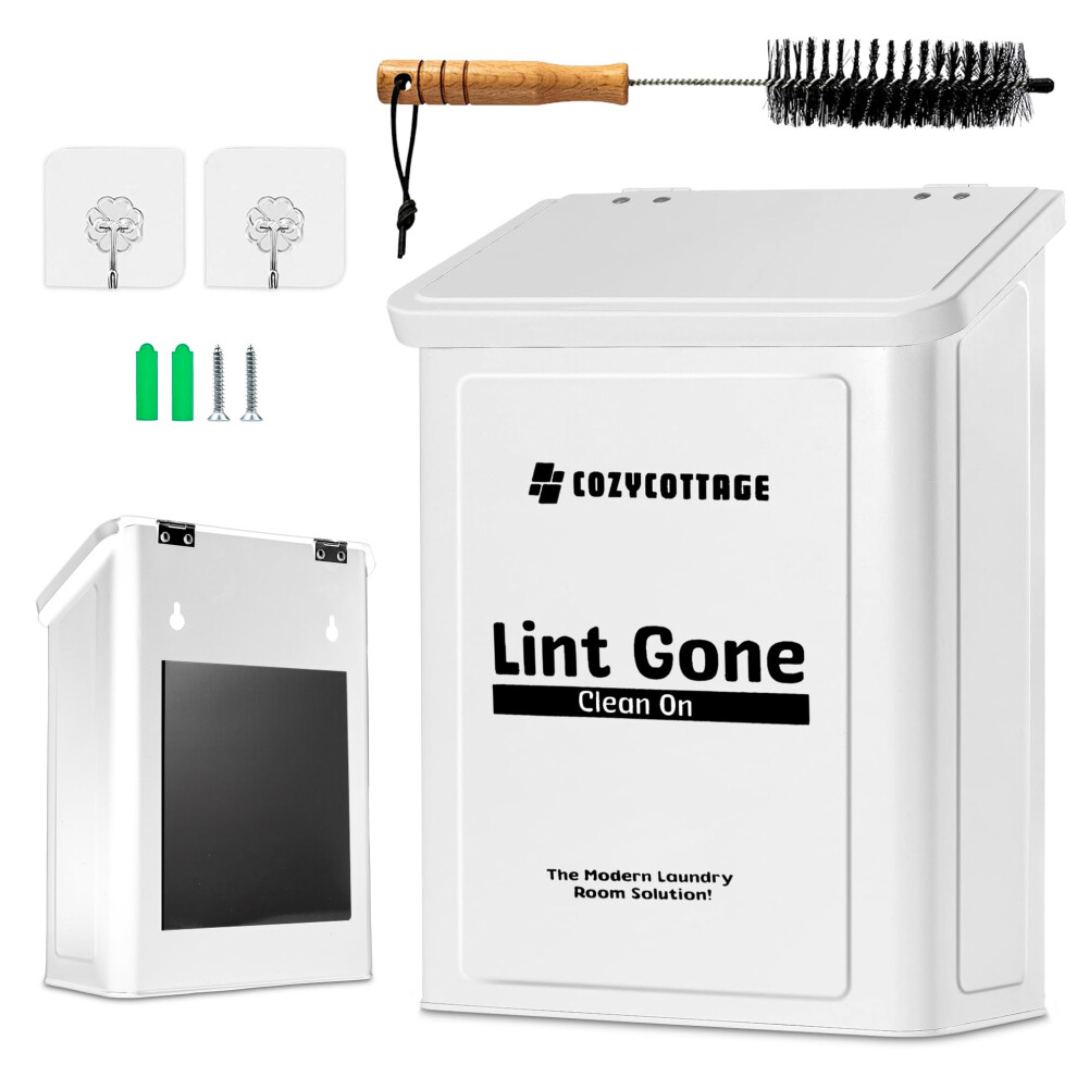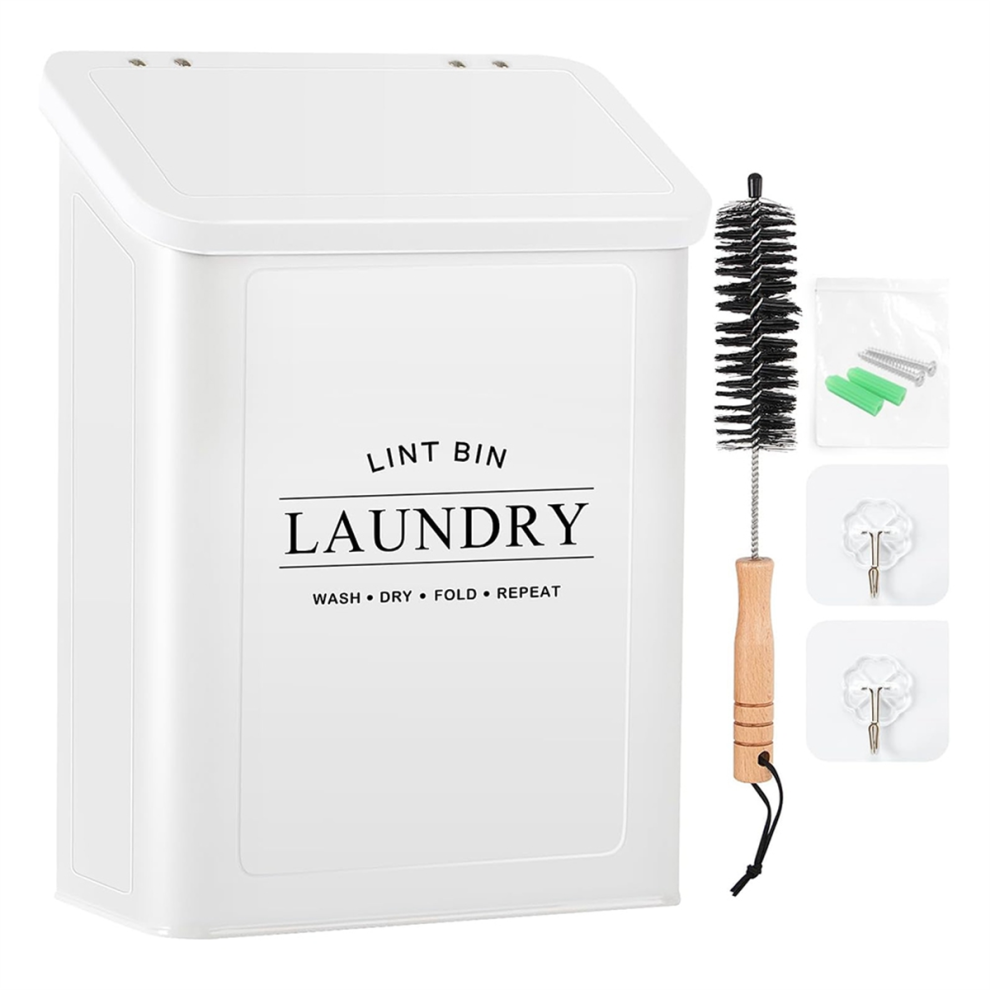 Magnetic Lint Bin for Laundry Room, Metal Container with Lid and Brush, Wall Mounted Box Dryer White