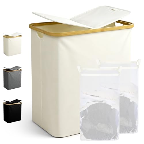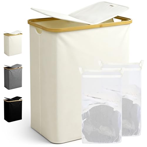 Lifewit 160L Laundry Basket with Lid, 2 Compartments Washing Basket with 2 Removable Liners & Bamboo Frame, Dirty Clothes Bin for Laundry Room Bedroom, Beige