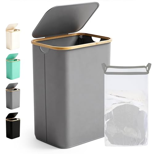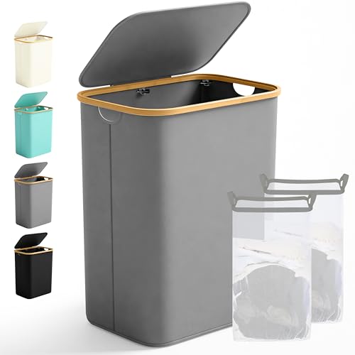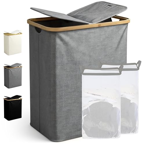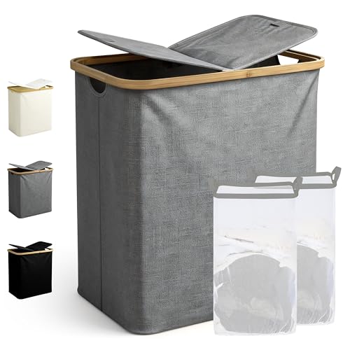 Lifewit 160L Laundry Basket with Lid, 2 Compartments Washing Basket with 2 Removable Liners & Bamboo Frame, Dirty Clothes Bin for Laundry Room Bedroom, Dark Grey