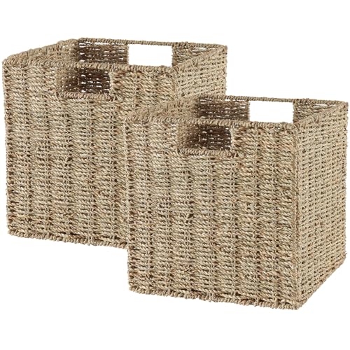 Vagusicc Storage Basket, Set of 2 Handwoven Seagrass Storage Baskets, Foldable Wicker Storage Basket 9 Inch Cube Storage Bin for Shelves Laundry Organizer Square Shelf Baskets, 9''x9''x9''