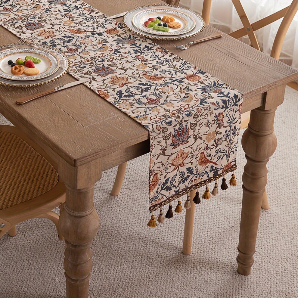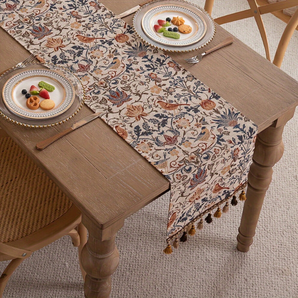 1pc Vintage Floral Bird Jacquard Table Runner with Tassels â Rustic Polyester, 12.99" Wide, for Dining/Coffee/Tea Tables